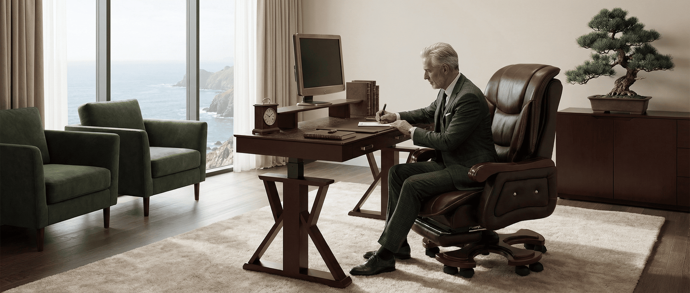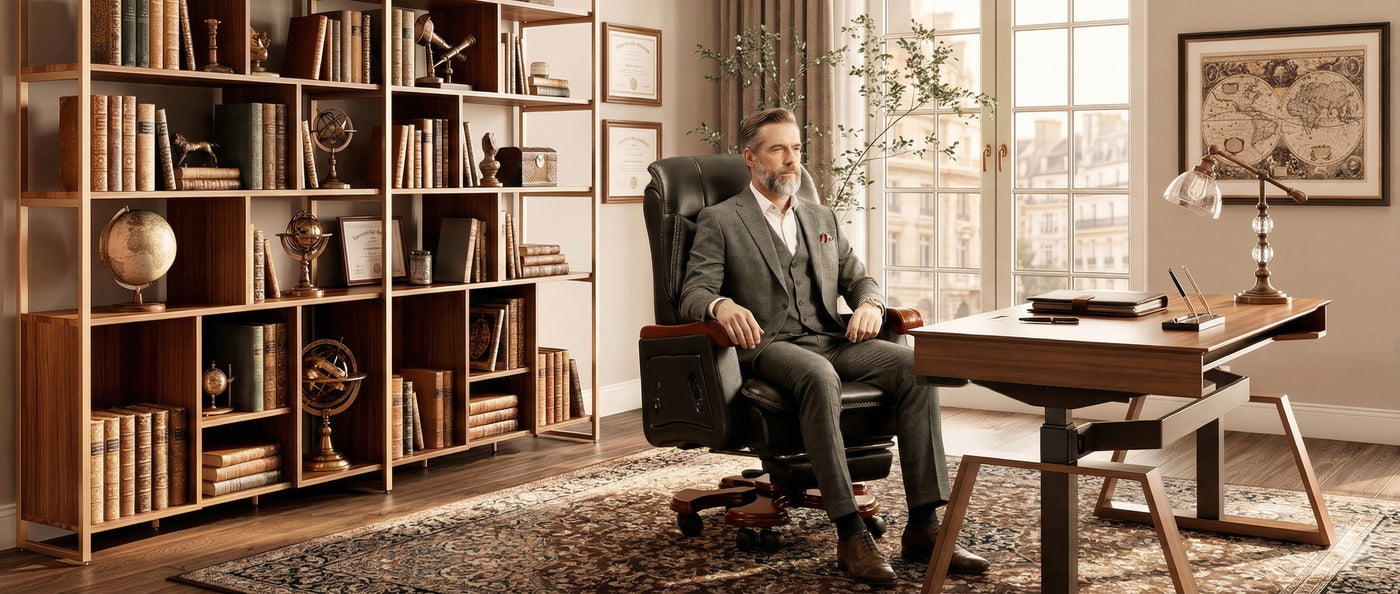 Retro Design + Luxury Full-Grain Cowhide upgrade blends retro-mid-century style with solid wood armrests (sturdier than plastic, no noise) and full-grain leather—elevates offices/studies to designer-level aesthetics.