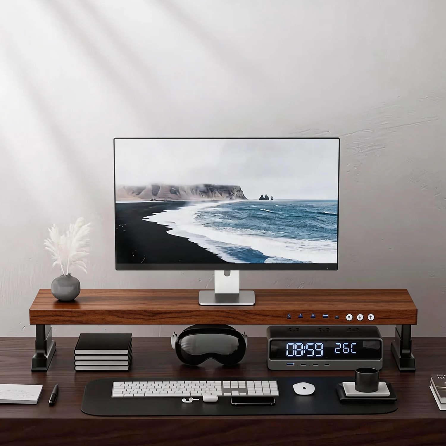 Upgrade your desk setup with our Multi-Functional Walnut Wood Monitor Stand. Designed for the modern professional, this isn't just a riser—it's a complete command center for your workspace. By elevating your monitor to eye level, it promotes better posture, reducing neck and eye strain during long working hours.