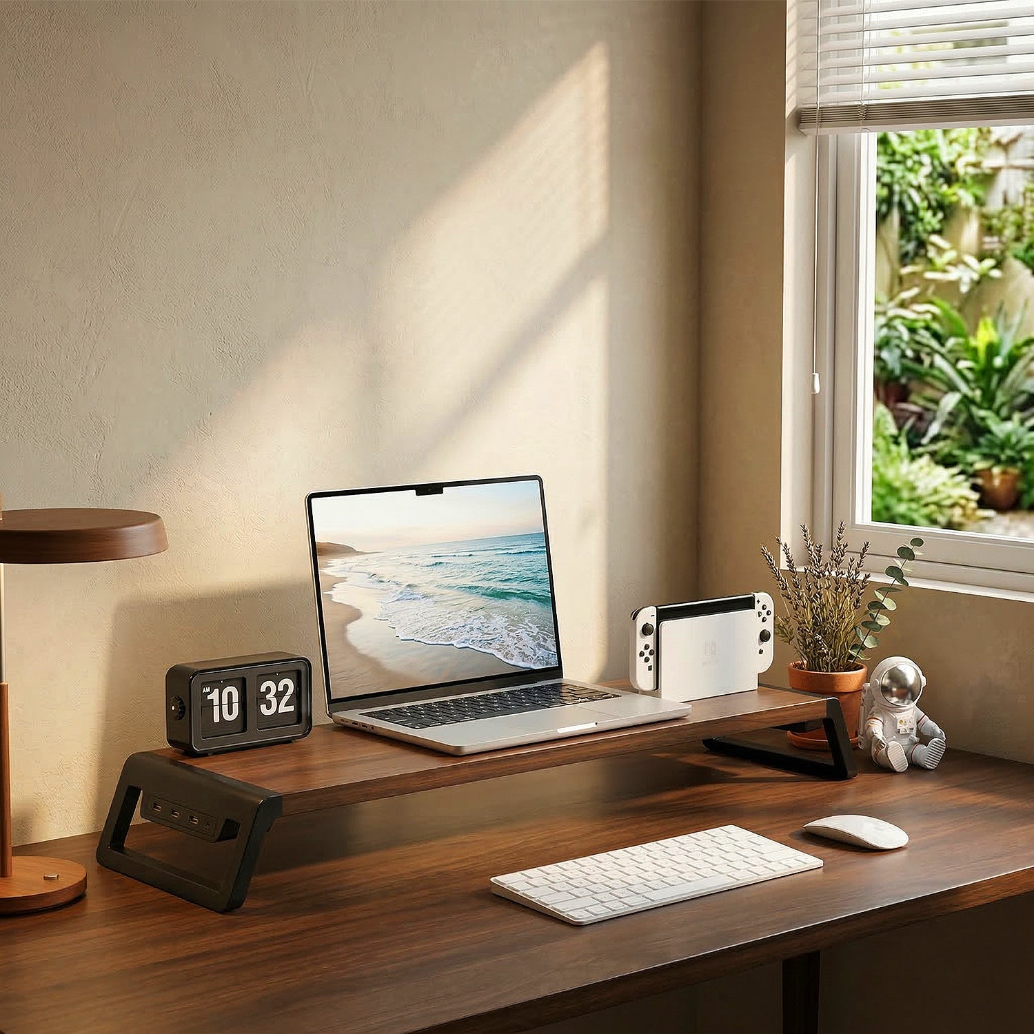 Transform your desk into a professional, clutter-free workstation with our Premium Ergonomic Monitor Stand. Crafted with a sleek wood-grain finish and heavy-duty industrial legs, this riser is designed to bring both sophisticated style and essential functionality to your home office or corporate setup.