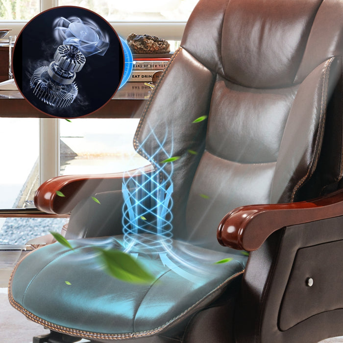 Contoured backrest fits spine curve; thick sponge distributes pressure. Heated back (cold months) + turbo fan ventilation (avoids overheating) for all-day comfort.
